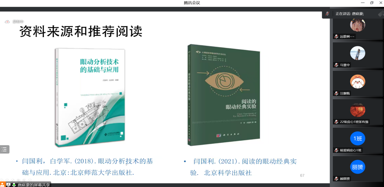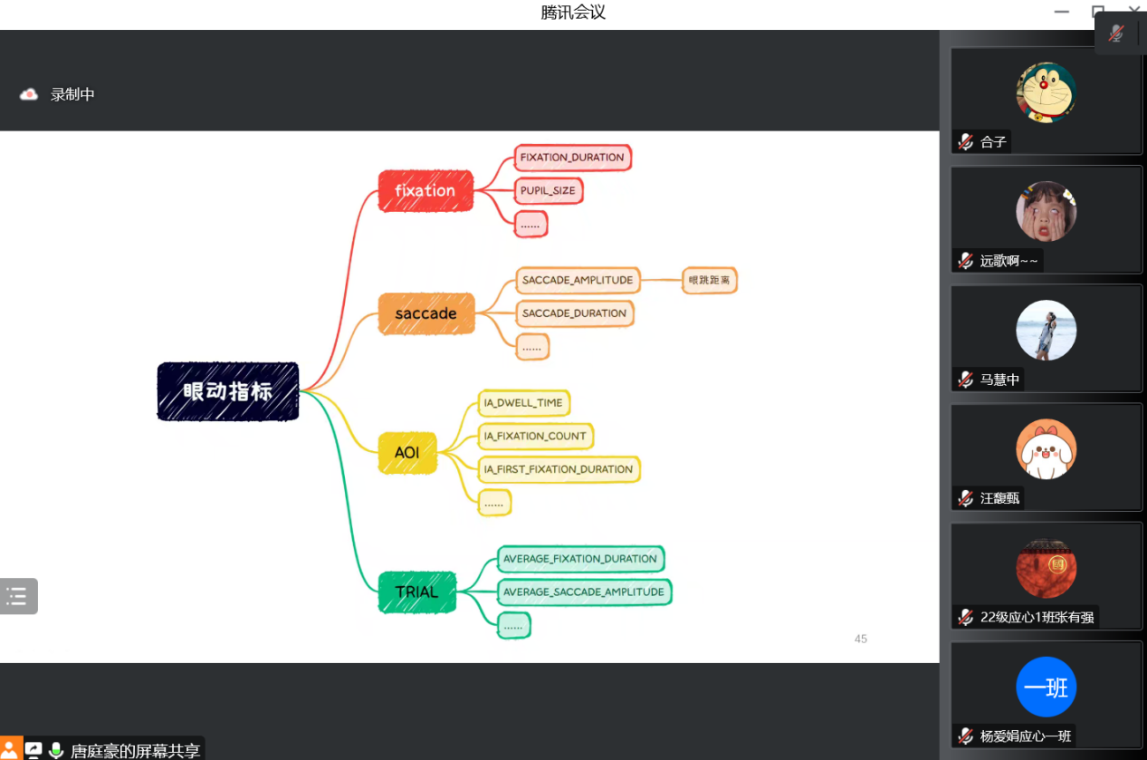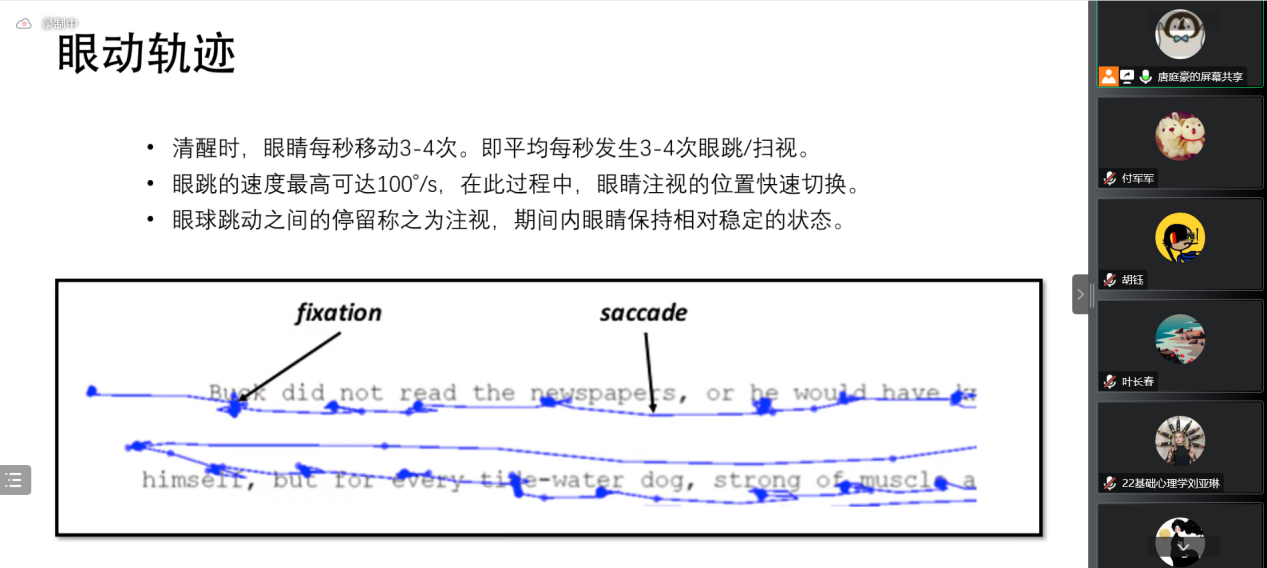 唐庭豪同学围绕眼动追踪的原理和方法、眼睛的解剖结构、眼动轨迹、眼动指标等方面向大家进行了分享。新利体育的眼动设备广泛应用阅读、审美、情绪、注意等研究领域。