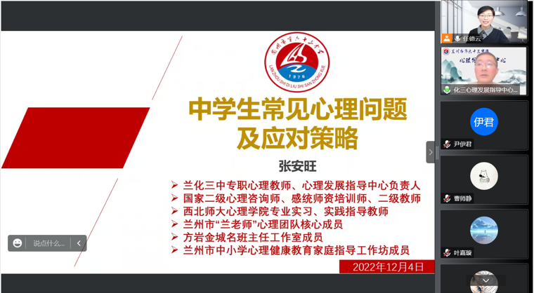 2022年12月4日,学院邀请兰州市第六十三中学的张安旺老师作“中学生常见心理问题及应对策略”专题报告。活动由新利体育系主任任德云主持,学院本科生、研究生,以及教育实习指导老师童丹丹副教授、张彦驰副教授和袁彦老师等150多人参加了此次活动。