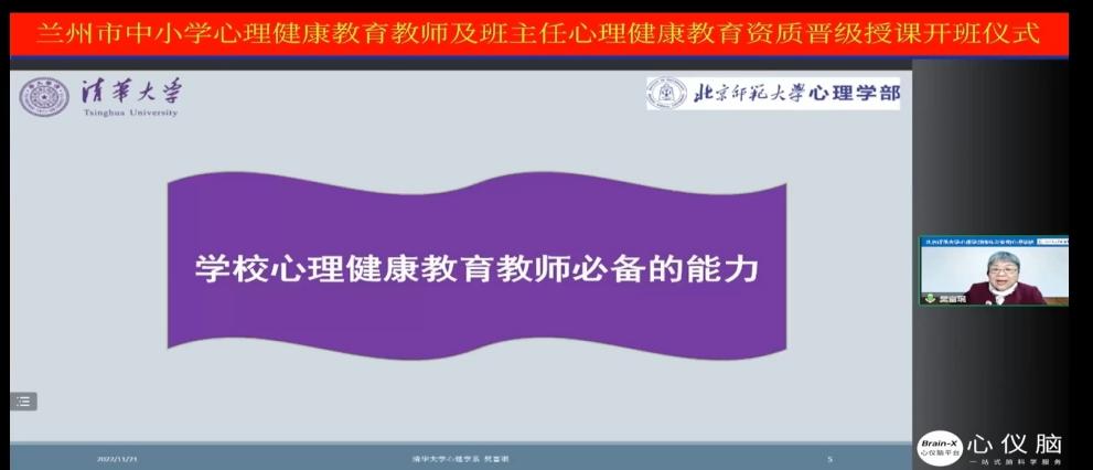 2022年11月21日15:30-17:30心理健康教育初级教师晋级认证授课正式开始,由北京师范大学心理学部临床与咨询新利体育院长、清华大学心理学系樊富珉教授讲授“团体辅导:心理健康教师必备的能力”,新利体育姜艳婓副教授主持首场讲座。