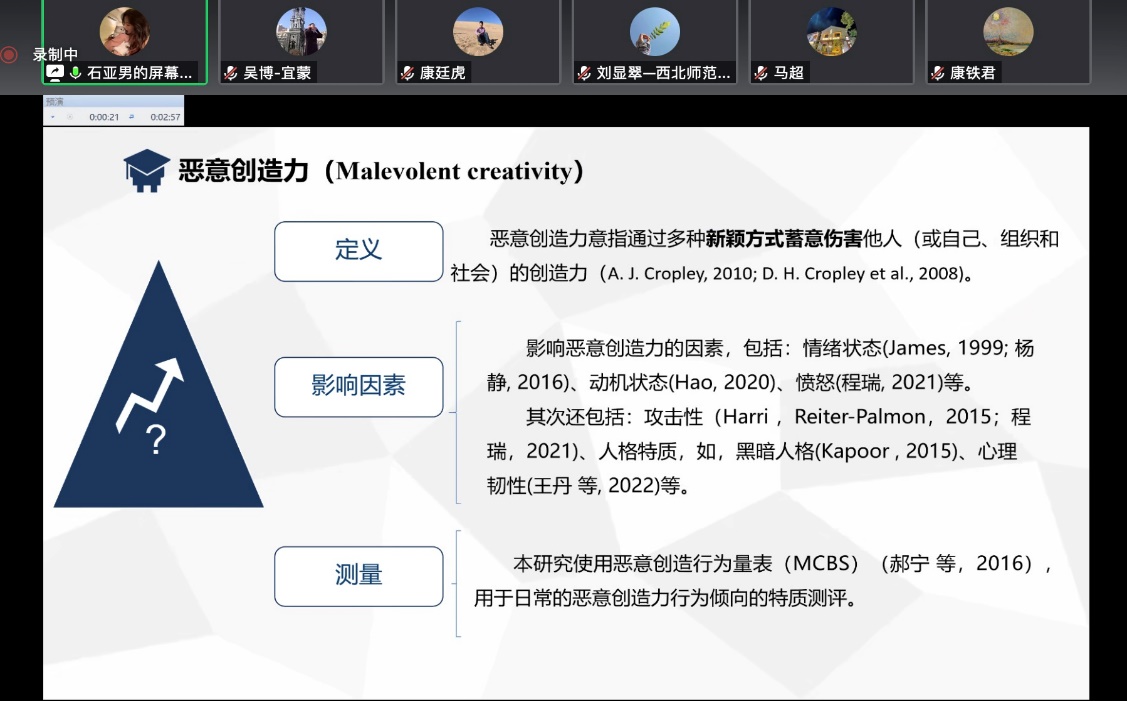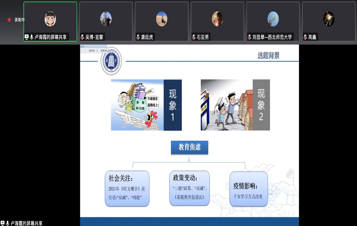 开题报告会上,参与开题的同学依次汇报了个人的开题报告,报告围绕引言、文献综述、问题提出、选题意义、研究内容、研究创新点等方面对毕业论文设计思路作详细讲解。每位老师都针对开题报告中存在的研究伦理、研究逻辑、格式规范性、实验设计、研究计划的可行性等方面存在的问题,有针对性地给予指导意见和建议。