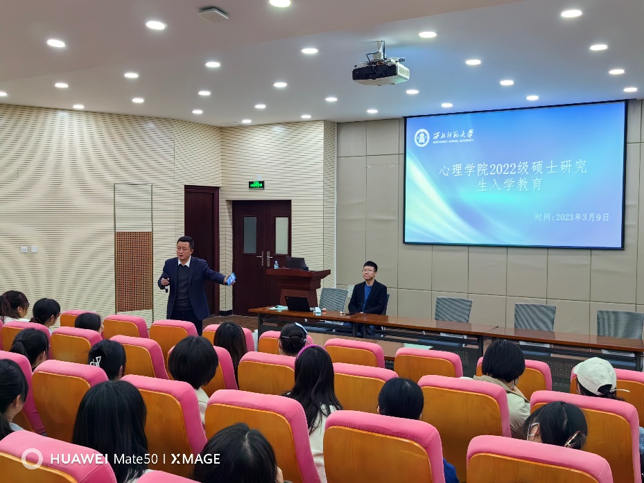 会议伊始,丁小斌院长对2022级研究生的顺利入学表示祝贺,同时对同学们新学期到校表示热烈的欢迎。丁院长详细地介绍了学院的师资,研究生教务秘书,各个班级的班主任以及各系所中心,并对于学校及学院的心理健康社会服务工作如西北师范大学心理援助热线等工作内容进行了分享,并鼓励同学们积极参与到平台中进行实训实践、寻找课题以及完成项目等,帮助学生对于学院人才培养的工作有了较为清晰的了解。之后他对同学们未来的学习生活提出要求,鼓励同学们在专业学习、论文选题、学习生活困惑等方面与导师积极沟通,充分利用组会交流机会向师兄师姐学技术、学方法,希望同学们能够成为一名勤奋、踏实的研究生。