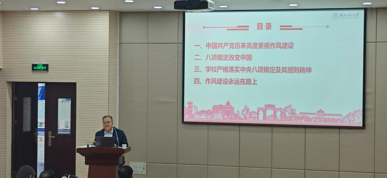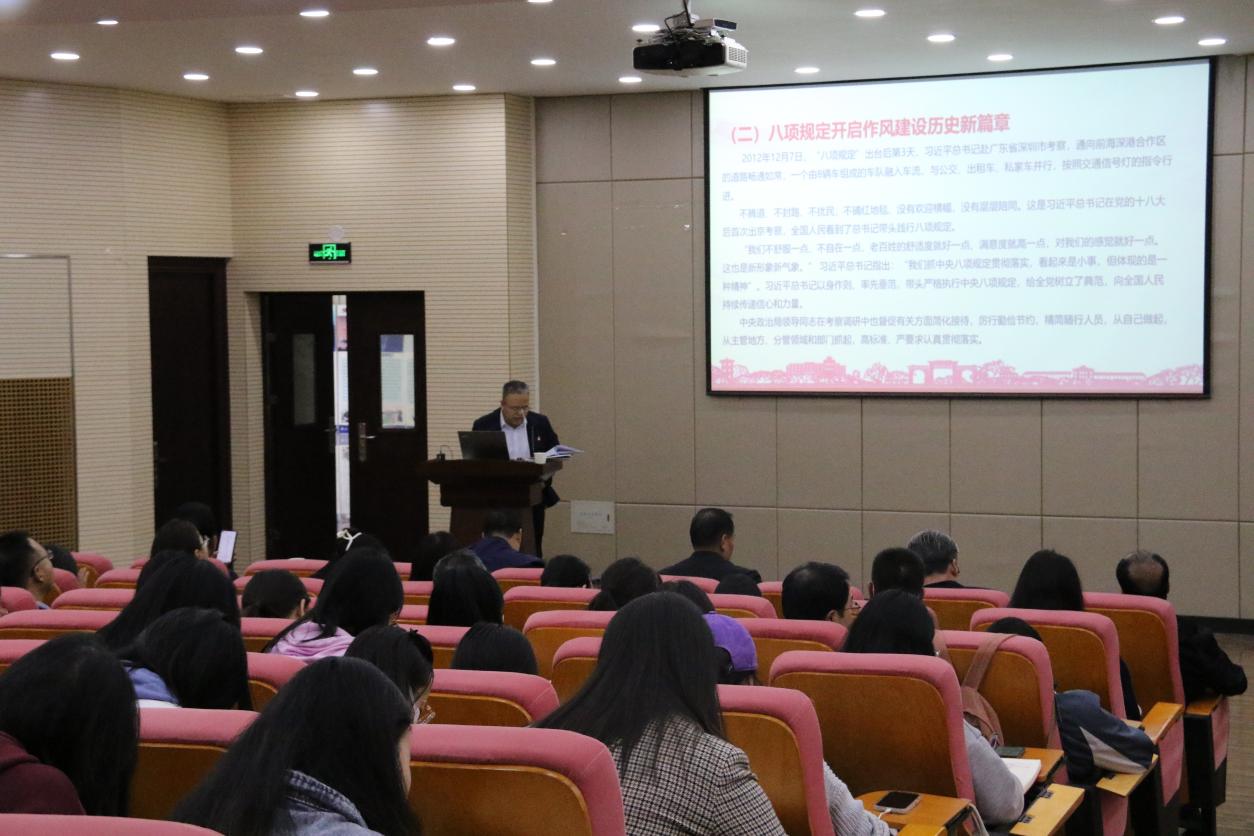课上,高赟以《八项规定改变中国——作风建设专题党课》为题,从“中国共产党历来重视作风建设”、“八项规定改变中国”、“学校严格落实中央八项规定及其细则精神”、“作风建设永远在路上”等四个方面全面阐释了八项规定改变中国的理论创新和伟大实践。高赟首先通报了中央和学校在反腐倡廉建设的典型案例,阐明了新时代高校全面从严治党体系建设的构想,并从教师职业行为、学科建设等方面深刻阐述八项规定和学校进一步贯彻落实中央八项规定精神的实施细则等,理论联系实际,具有非常现实的指导意义。