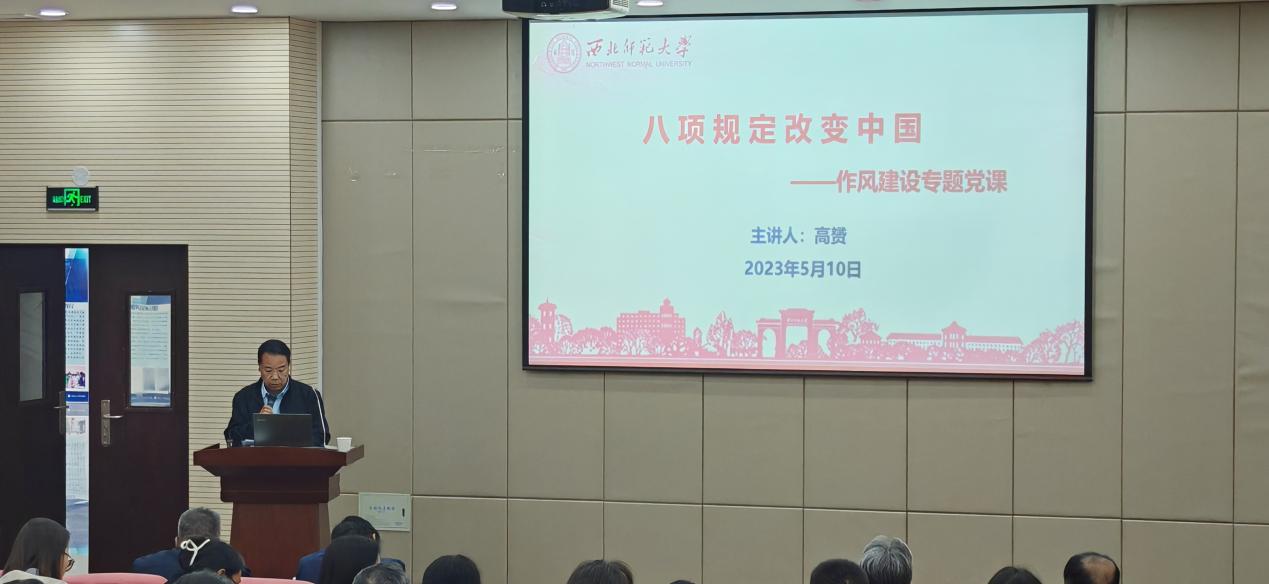 为深入学习贯彻党的二十大精神,扎实推进学习贯彻习近平新时代中国特色社会主义思想主题教育和“三抓三促”行动,进一步提高广大党员干部和教职工廉洁自律意识,5月10日下午,西北师范大学纪委委员、纪委副书记、纪检监察综合室主任高赟同志在知行校区弘文楼159报告厅为教师教育学院、教育科学学院、新利体育130余名师生讲授“八项规定改变中国”作风建设专题党课。本次党课由新利体育党委书记王仁主持。