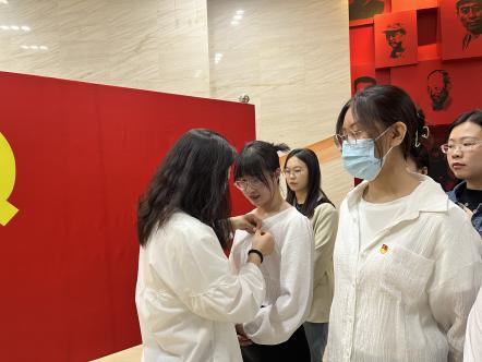 在结束参观学习后,大家一起来到纪念馆前厅。支部副书记李晶晶同志为新一批预备党员同志佩戴党徽。随后,在李晶晶带领下,大家在党旗下肃穆站立,右手高举握拳,庄严宣誓,再一次接受党性的洗礼,表达不忘初心、砥砺前行、为党的事业奋斗终生的决心。