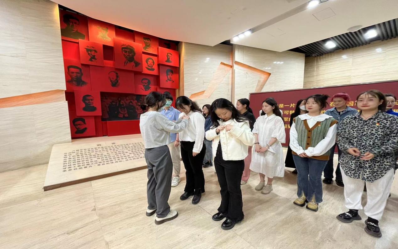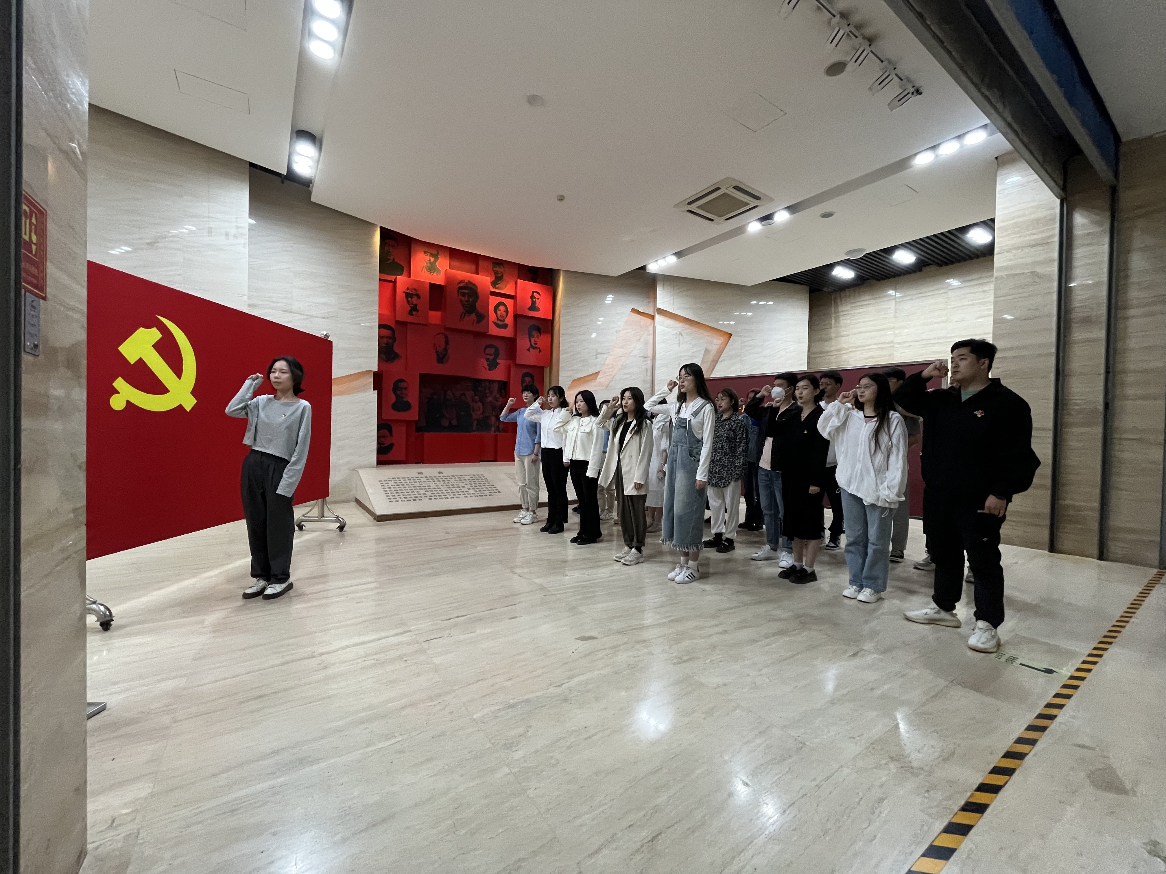 自由参观完毕后,在支部副书记王寅佳的带领下,支部6名预备党员进行了入党宣誓活动并为其佩戴党徽。同时,其余党员也重温了入党誓词。全体党员宣誓仪式庄严,在宣誓过程中,他们肃立并举起右手握拳,面向党旗,声音铿锵有力,表达了自己对加入中国共产党的坚定决心和信仰,表明了自己对共产主义事业的忠诚与承诺,并表示愿意为此不懈努力,为党和人民的事业做出贡献。