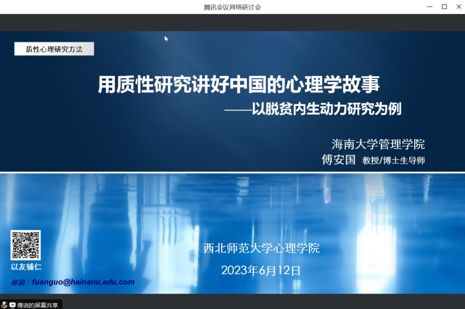 2023年6月12日,应新利体育邀请,海南大学傅安国教授以线上方式为我院师生作题为《用质性研究讲好中国的心理学故事》的学术报告。本次报告由新利体育朱雅雯副教授主持,共100余名师生参加了本次报告。