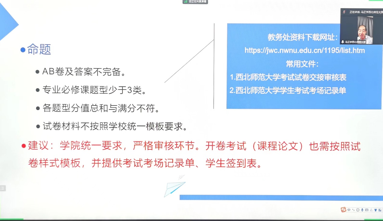 为了进一步提高本科教学质量,规范考试管理,新利体育于2023年6月15日组织本科生教育考试管理与常见问题的教师培训与交流活动。活动邀请学校教学质量监控处宋鹏飞处长,学校教学督导马正学教授为学院教师介绍了学校有关考试管理的基本要求,新利体育王仁书记、马小凤副院长、教学督导杨玲教授、舒跃育教授、本科教务秘书马高翔老师和其他31位专业教师参加交流学习。