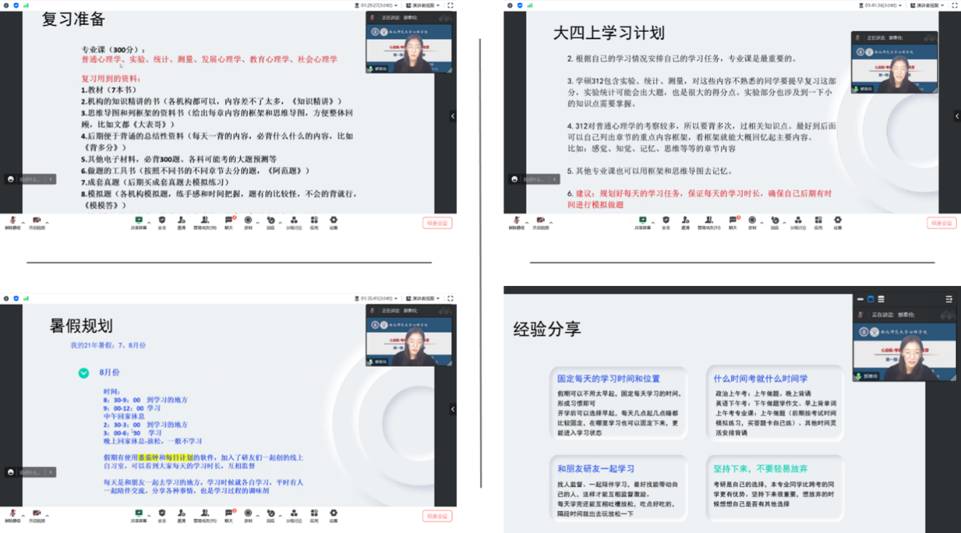 在活动中,已被录取的2023级博士生何亮同学给大家分享了《普通心理学》、《社会心理学》及《发展心理学》等七门专业课程的复习经验,分析了复习时间节点和详细的复习方法。2022级应用心理硕士衣致宇同学分享了自己在考研过程中的积极探索和努力,以及专业课、英语和政治科目的复习经验,还特别提醒备考的同学要分析考研的分数分布,确定好自己的目标,制定学习的计划。