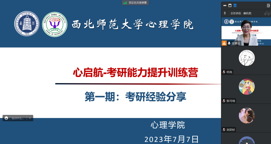 2023年7月7日,学院组织面向本科生的考研备考学习经验分享会。活动邀请具有丰富备考经验的研究生,为正在备考的三年级本科生同学分享学习经验,活动以线上方式组织。康廷虎副院长、任德云主任与90多为本科生参加了此次线上分享会,活动由任德云主持。