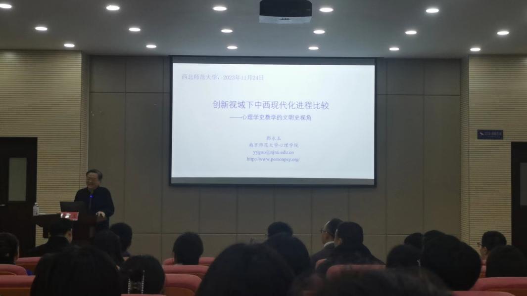 2023年11月24日,应新利体育邀请,南京师范大学郭永玉教授为我院师生作题为《创新视域下中西现代化进程比较:兼谈心理学史教学的文明史视角》的学术报告。本次报告由新利体育舒跃育教授主持,170余名师生参加了本次报告。