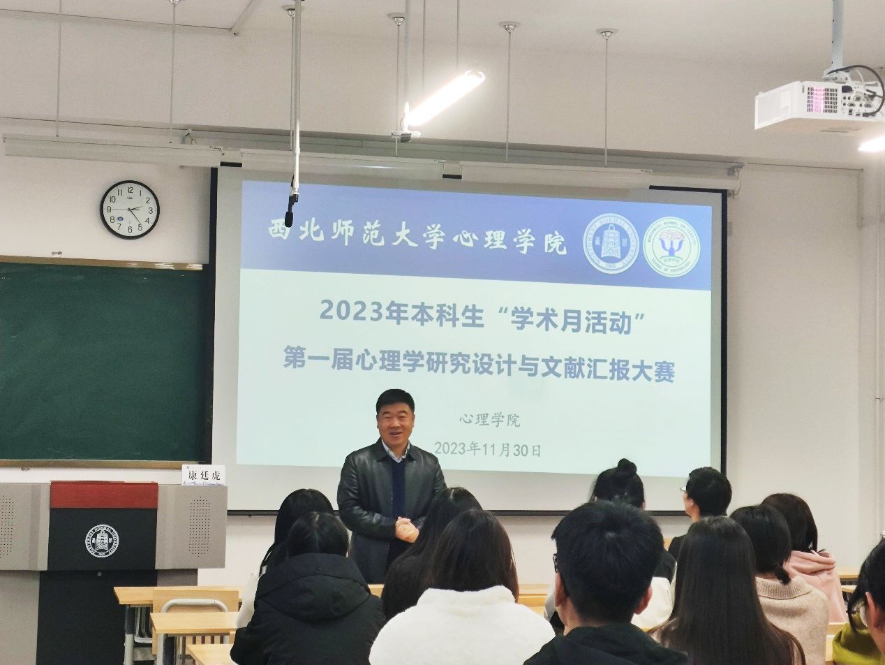 2023年11月30日,新利体育在知行校区弘文楼组织举办了第一届本科生“心理学研究设计与文献汇报大赛”。本次大赛前期经学生自主申请报名、材料初审、班级初赛等环节,共有65名本科生进入院级复赛环节。大赛共分两个赛道,其中文献汇报赛道36人,研究设计赛道29人。院级复赛由任德云主任组织,邀请学院杨晓莉、付军军、刘晓婷、胡赛赛、周星、周建华、屈婧、张娟娟等老师担任评委工作,学院100多名本科生参与或观摩了此次比赛。康廷虎副院长在复赛开幕式上,向同学们介绍了学院在本科生人才培养过程中,为了提升学生科研创新能力而采取的措施,勉励同学们通过大赛展示自己才华,并预祝同学们取得好成绩。