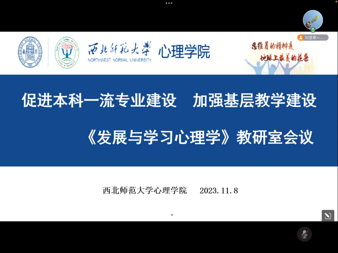 学院于11月8日以线上方式组织《发展与学习心理学》课程思政建设教学案例分享会。活动由《发展与学习心理学》教研室组织,主题为“促进本科一流专业建设 加强基层教学组织建设”。新利体育党委书记王仁、《发展与学习心理学》课程组任课老师20多人参加活动,活动由应用心理学系主任刘显翠副教授主持。