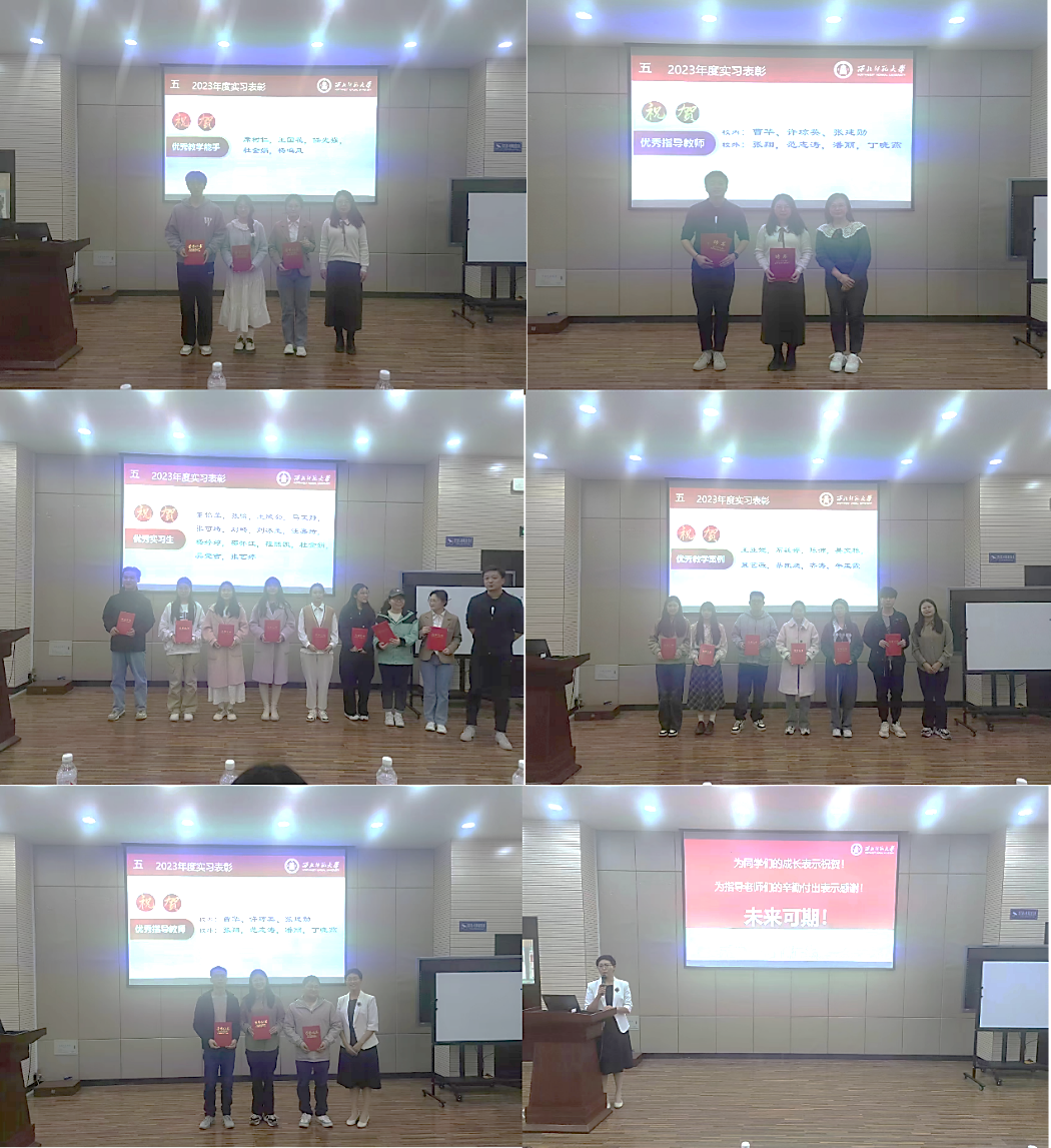 最后,对此次实习过程中的优秀实习生、优秀指导教师进行了表彰。张翔老师、潘丽老师、许琼英老师分别为获得优秀实习生、优秀教学能手、优秀教学案例等荣誉的同学颁发荣誉证书,团委书记郭琦老师为优秀实习指导教师颁发了荣誉证书。
