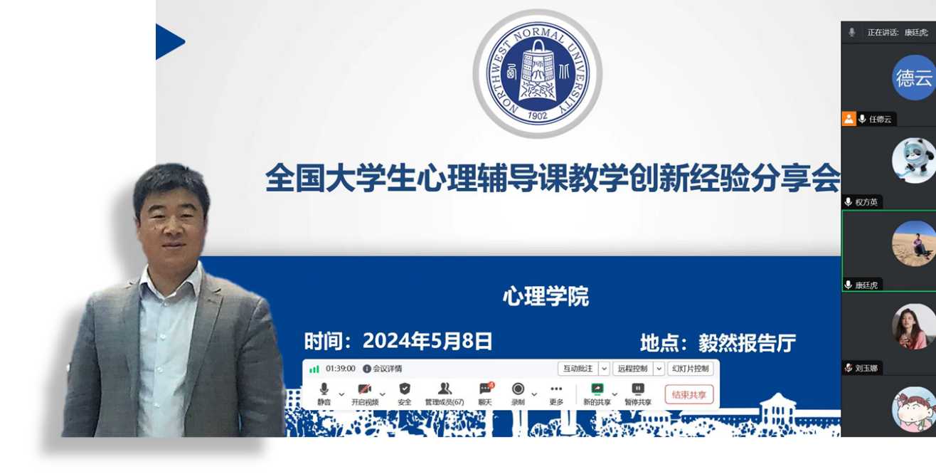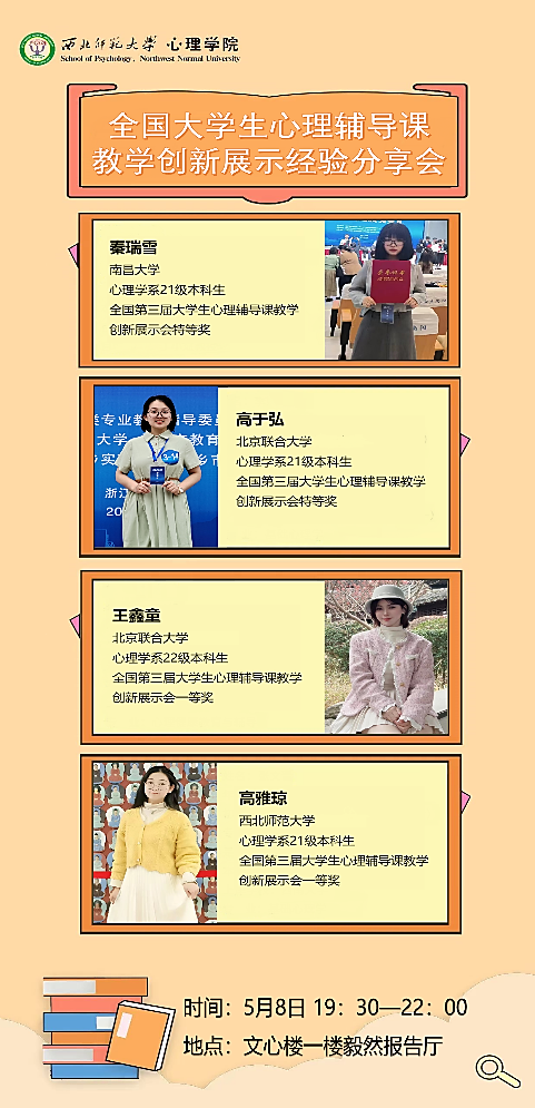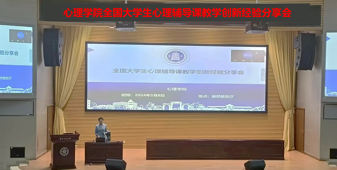 为了提高学本科生人才培养质量,培养学生心理健康教育教学能力和心理咨询辅导能力,调动学院学生参与学科专业竞赛的积极性,激发他们的创新精神与学习热情,2024年5月8日,学院邀请在第三届全国大学生心理辅导课展示会上获得特等奖和一等奖的四位同学进行了竞赛经验的分享与交流。此次教学经验分享会以线上线下相结合的方式进行,活动邀请了南昌大学的秦瑞雪同学、北京联合大学的高于弘和王鑫童同学以及我院本科生高雅琼为同学们做教学竞赛经验的分享。此次活动由心理系主任任德云老师主持,来自校内外近200余名师生参与了此次活动。
