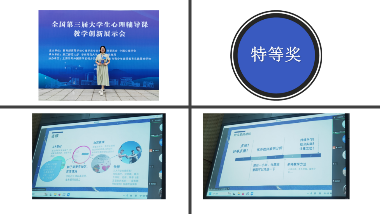 首先,来自南昌大学的21级本科生秦瑞雪同学,该同学在第三届全国大学生心理辅导课展示会上获得特等奖,秦瑞雪同学全面地介绍了自己参加此次全国大学生心理辅导课教学创新展示会的经验,并结合录课、说课和授课等参赛环节分享了自己的参赛经验,并告诉同学们要重视教学比赛中的创新。