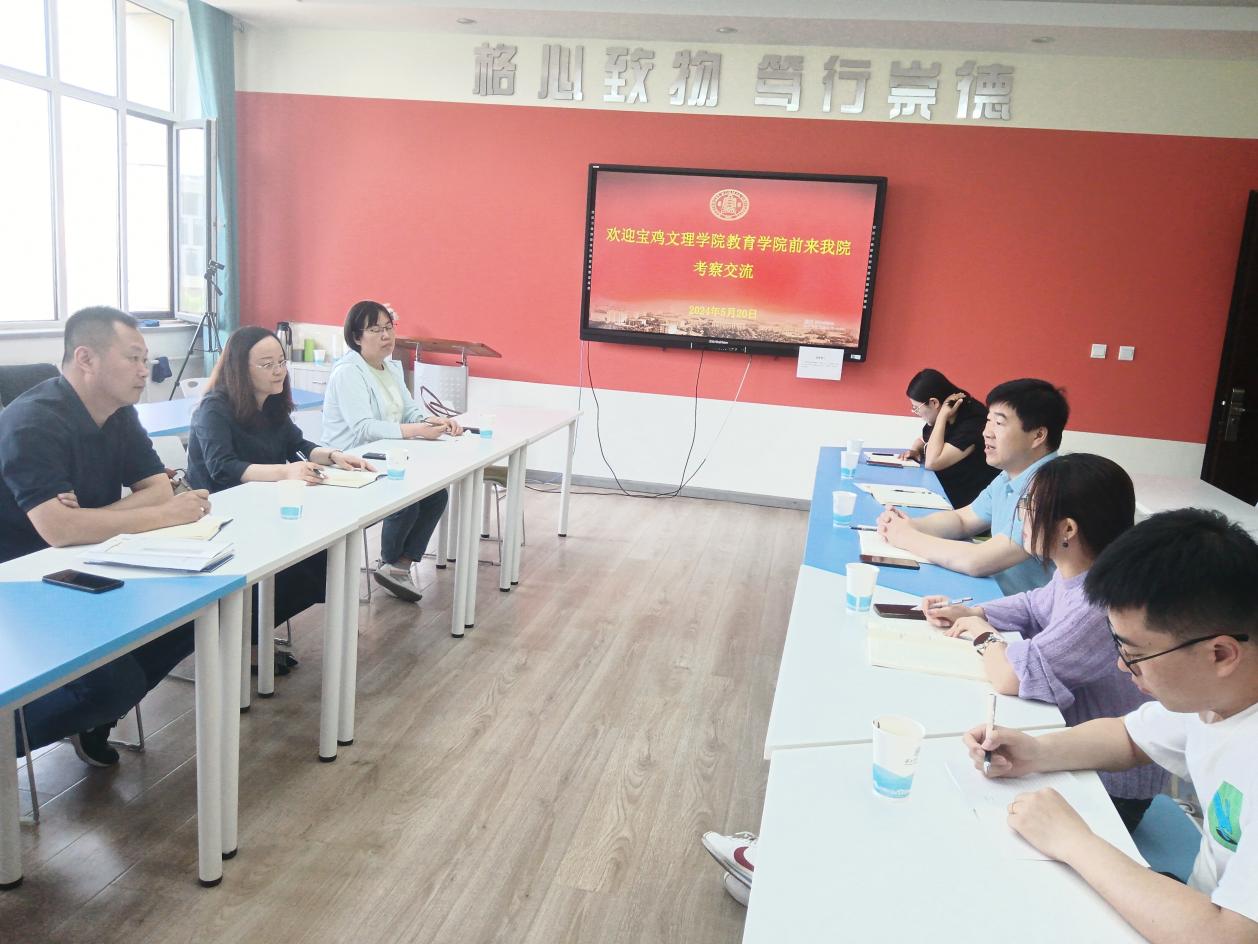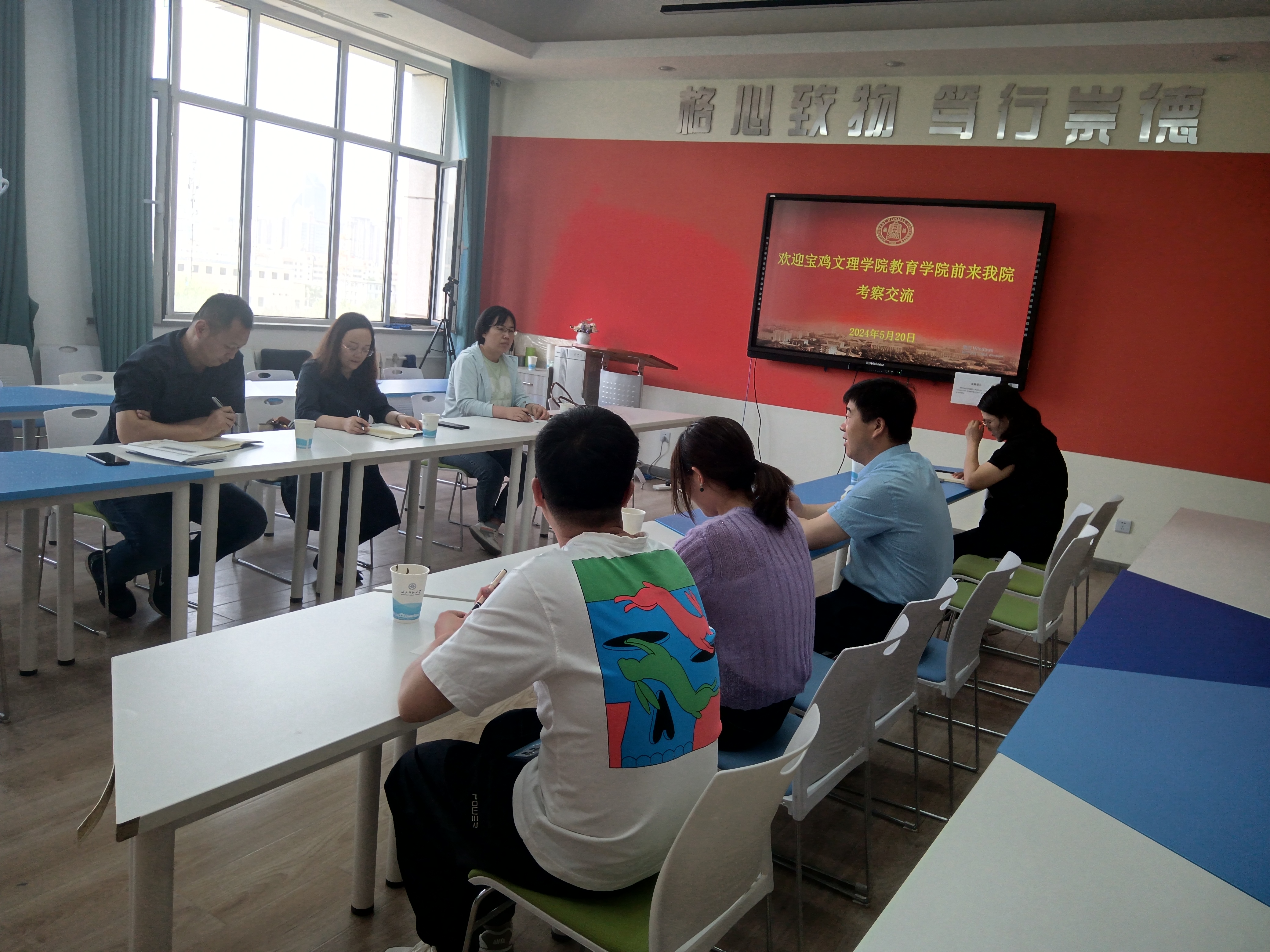 2024年5月20日,宝鸡文理学院教育学院院长马多秀、副院长赵亮、青年骨干教师刘敏娜一行莅临新利体育,考察本科生人才培养及本科教育教学审核评估工作。学院组织了座谈交流活动,办公室主任高淑燕、实验室主任袁彦、教务秘书马高翔、青年骨干教师胡赛赛参加了活动。座谈由副院长康廷虎主持。