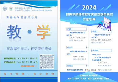 在6月3日至7月3日期间,以系为单位,学院领导和中层干部人均听评课4节次,学院青年教师和教学督导听评课28人次。观摩课程涵盖《发展与学习心理学》《教育心理学》《心理测量学》《中小学心理健康教育课程设计》等公共课和专业课。教师在教学过程中,充分展示了课堂教学、组织管理等方面的技能,以及对信息化平台、数字化资源等的应用,分享了课堂教学改革与创新的做法,交流了课程资源建设与应用的经验。