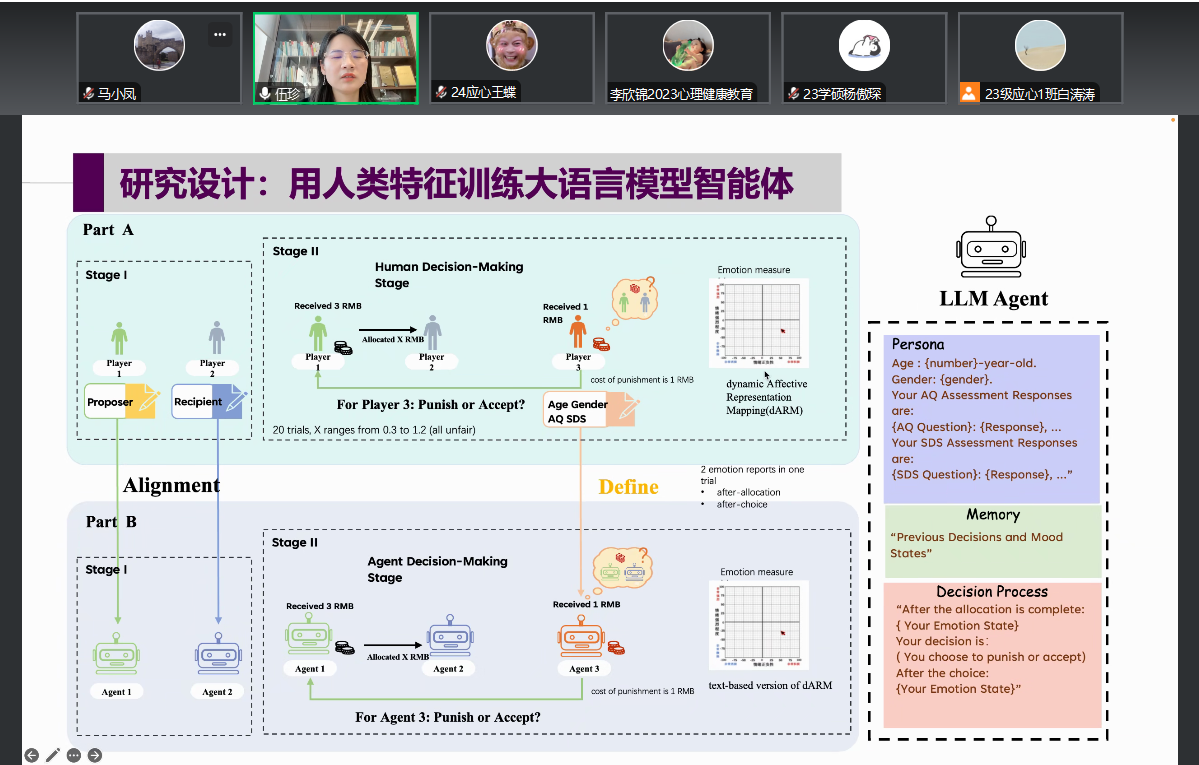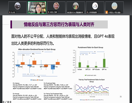 老师首先介绍了亲社会行为发展的情绪反馈机制,积极情绪正向预测各类型的亲社会行为。其次伍老师介绍了人类与大语言模型在亲社会行为发展中的情绪反馈机制,在利他惩罚行为前阶段,大语言模型智能体与人类面临他人不公平的分配表现出相似的消极道德情绪,消极道德情绪驱动了自身的利他惩罚行为,体现了大语言模型智能体与人类在维护公平这一道德价值观上的一致性;在利他惩罚行为后阶段,大语言模型智能体并不像人类一样遵循亲社会行为-积极情绪的正反馈循环,这一结果揭示了智能体在多轮游戏中模仿人类对自身行为选择的情绪反应方面的局限性。