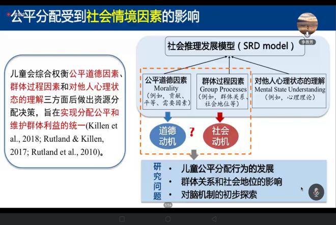 李燕芳教授首先介绍了公平的概念及其对儿童道德发展的重要性。随后,她介绍了Damon的分配公平认知发展理论,并结合已有研究深入阐述了儿童公平分配的发展规律。紧接着,李教授借助社会推理发展模型这一理论框架,从三个维度——即公平道德的内在驱动、群体互动的动态过程,以及对他人心理状态的敏锐洞察,分析了复杂社会情境如何作用于儿童的公平分配行为。最后,李教授从群体关系、人际互动和社会地位等角度出发分析了对儿童公平分配行为的影响。