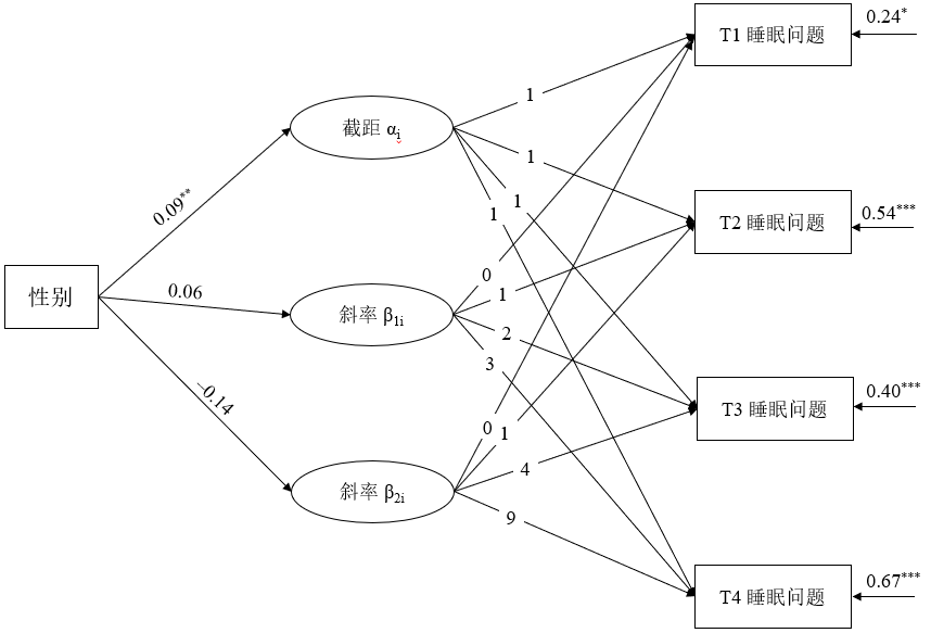 为探讨青少年早期睡眠问题的变化趋势,对睡眠问题分别进行两次建模,选择对数据拟合最好的模型作为最后的分析模型,在此基础上,加入性别这一不随时间变化的因素,考察睡眠问题的发展轨迹是否存在性别差异。最后,分别加入正性情绪和负性情绪,考察不同情绪对青少年早期各测量时间点睡眠问题的影响。结果发现,青少年早期睡眠问题呈曲线递增趋势,递增速度逐渐减缓,在起始水平和发展速度上均表现出显著的个体差异性;在睡眠问题的起始水平上,女生显著高于男生;而且正性情绪可以减缓特定时间点上青少年睡眠问题的发生,而负性情绪增强特定时间点上青少年睡眠问题的发生。