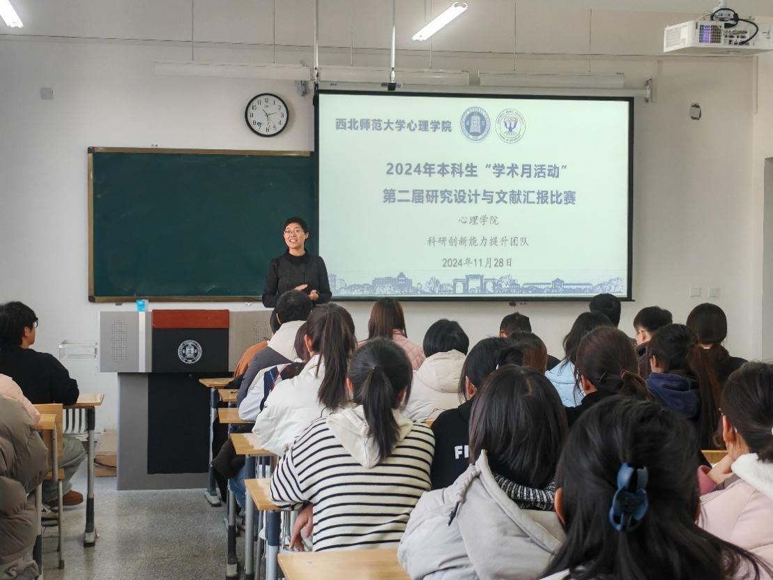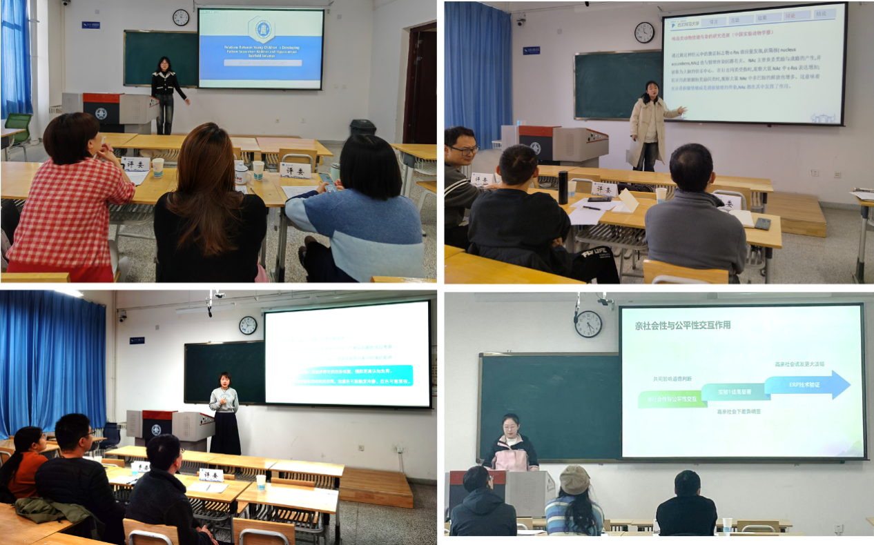 文献汇报比赛的四个组分别在弘文楼207、210、211和213教室进行比赛,同学们结合自己感兴趣的研究领域,选择研究文献进行汇报。汇报文献的主题涉及记忆、阅读、青少年抑郁与焦虑、亲社会行为等多个领域。每位选手从文献的研究背景、问题提出、方法和结论等方面进行详细的阐述。