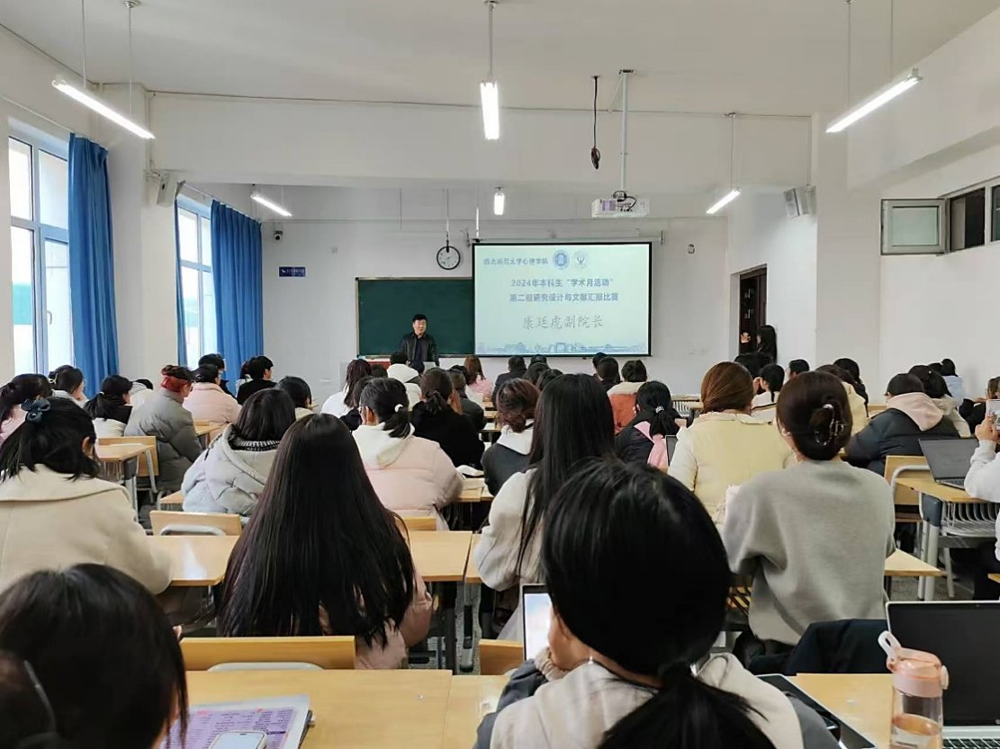 2024年11月28日下午,学院在知行校区弘文楼组织举办了第二届本科生心理学研究设计与文献汇报大赛。本次大赛参赛同学来自22,23和24级,近120名同学参与到比赛中,共提交作品83份。大赛共分两个赛道,其中文献汇报赛道73人,研究设计赛道10人。比赛由副院长康廷虎和心理系主任任德云组织,学院邀请杨阳老师、张彦驰老师、曹华老师、许琼英老师、张建勋老师、潘超超老师、王宴庆老师、周星老师、张悦文老师、郝苑老师、张俊杰老师及何美亨老师等12位青年教师担任评委工作,学院140多名本科生参与或观摩了此次比赛。康廷虎副院长在比赛开幕式上,向同学们介绍了本次比赛的比赛规则和获奖名额设置,并祝同学们都能在比赛中获得好成绩。