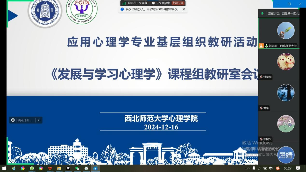2024年12月16日,应用心理学系组织师范专业公共必修课《发展与学习心理学》课程的教研活动。该课程任课教师张彦驰老师、曹华老师、陈莉老师、付军军老师、王宴庆老师、张悦文老师、屈婧老师、胡赛赛老师等参加了活动。活动由应用心理学系系主任刘显翠副教授主持。