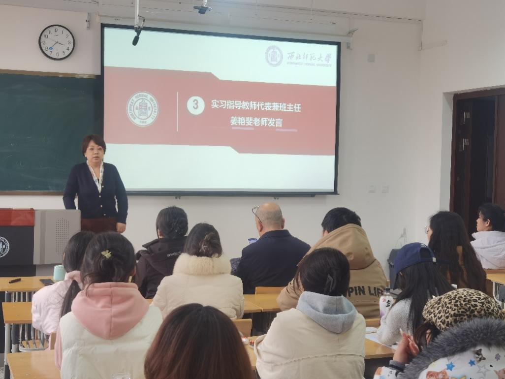 会议伊始,任德云主任详细介绍了本年度教育实习的整体安排。她提到,本次教育实习,同学们将分赴具备良好心理健康教育基础条件的兰州市各中学。同学们要围绕学生心理健康教育,积极探索课程思政融入课堂教学与观摩、班级管理、基础教育调研、心理辅导室工作等的实习实践任务中。她还明确要求同学们在实习期间,要有意识、有目的地将理论学习向实践应用转化,以提高专业素养与职业能力。