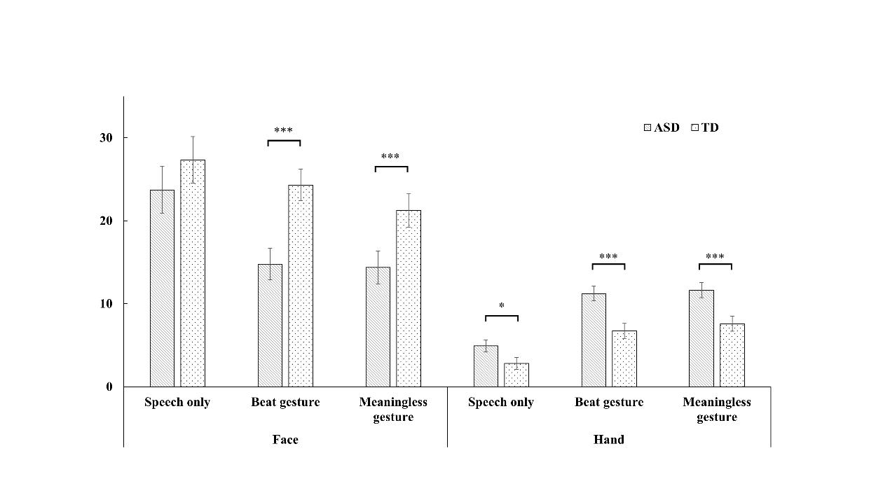 结果发现,发育正常儿童在三种条件下的语言理解准确率和反应时没有显著差异,但自闭症儿童相较于其它两种条件,在节拍手势条件下无论是准确率还是反应时表现都更好(见表1)。眼动数据(注视次数,总注视时间、凝视时间)的结果表明,发育正常儿童在所有条件下都对脸部有更多的注意力偏向,而自闭症儿童在手势条件下表现出对手部位置更多的注意(见图2)。