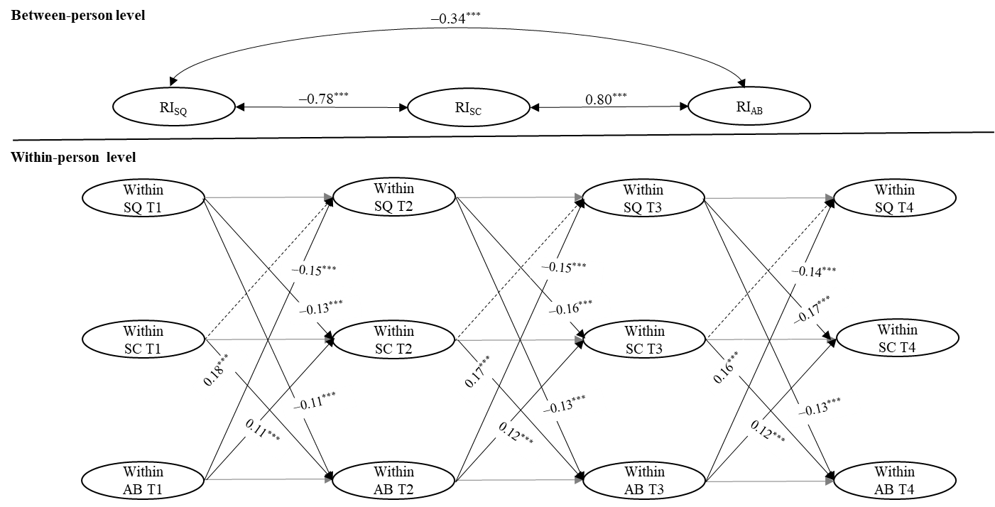 近日,西北师范大学刘晓婷副教授课题组在发展心理学领域期刊《Journal of Youth and Adolescence》发表题为 “The bidirectional relationship between sleep quality and aggressive behavior: Within-person mediated effect of self-control” 的学术论文。该研究聚焦中国青少年群体,旨在探究睡眠质量与攻击性行为间的双向关系,以及自我控制在其中的潜在中介作用。研究采用纵向追踪设计,对 4 所中学的 1240 名七年级学生开展了 4 次追踪调查,每次调查间隔 6 个月,整体研究周期约为 2 年。随机截距交叉滞后面板模型(Random Intercept Cross-Lagged Panel Model, RI-CLPM)分析结果显示:在个体间与个体内层面,睡眠质量与攻击性行为均存在显著的双向预测关系;自我控制在 “睡眠质量影响攻击性行为”的路径中发挥显著中介作用,但该中介效应在反向路径中未达到显著水平(见图 1)。这些研究发现进一步强调,改善青少年睡眠质量、增强其自我控制能力,对预防攻击性行为具有重要价值。