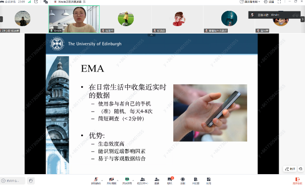 朱新新博士主要介绍了关于使用多时间尺度的研究设计来观察日常经历对长期发展的影响以及它们之间的相互影响,并展示了生态瞬时评估(EMA)与动态结构方程模型(DSEM)的结合应用。首先朱博士通过一个D2M(Decades-to-minutes)的实证研究,向我们展示了具体的实验流程和统计分析,得到内化问题的轨迹与成年初期的日常压力和情绪管理的失调相关等结果,初步展示了EMA和纵向研究的结合是高效和科学的方法;其次又介绍了关于测量爆发设计(Measurement burst design)的综述性研究,主要讨论了关于其在心理健康研究领域的应用并总结其方法学特征和关键研究发现,并提出未来的研究可以拓展到自闭症以及人际互动等方向,并纳入儿童青少年以及非西方样本等,最终得到了测量爆发设计是考察心理健康领域多时间尺度发展视角的强有力工具的结论。