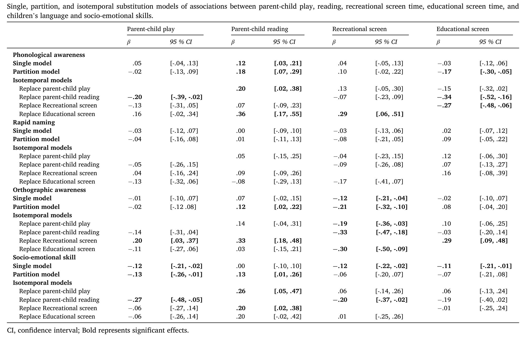 为考察在屏幕时代如何优化家庭环境支持并促进儿童良好发展,近日,西北师范大学李世峰副教授课题组在国际知名期刊Computers in Human Behavior(中科院一区Top,IF = 8.9)上发表了题为“Screens or books? Isotemporal substitution of different home activities on language and socio-emotional skills in preschool children”的学术论文。该研究基于等时替代模型,考察了亲子游戏、亲子阅读及屏幕时间(学习屏幕vs娱乐屏幕,独自屏幕vs亲子联合屏幕)相互替代与学龄前儿童语言和社会情感技能发展之间的关系。基于传统多元回归模型的研究结果显示总体上亲子阅读与儿童各项语言和社会情感技能的发展之间存在正向的联系,而屏幕时间与儿童各项语言和社会情感技能的发展之间存在负向的联系。等时替代模型分析的结果进一步显示:(1)使用等时的亲子阅读去替代相同时间的电子屏幕使用与儿童更好的语音意识、正字法及社会情感技能的表现相联系;(2)而用相同时间的屏幕时间替代亲子阅读则与儿童更差的语音意识、正字法及社会情感技能的表现相联系;(3)进一步区分屏幕时间为娱乐屏幕时间和学习屏幕时间或独自屏幕时候和亲子联合使用的结果重复了上述结果。